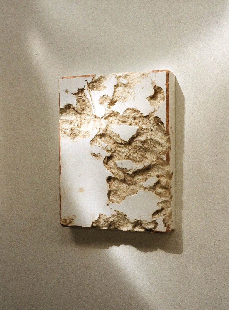 A travers plusieurs techniques comme la création de moule, les prises d’empreintes, les tirages en terre et en plâtre, Romane a une pratique presque archéologique. Une archéologie du souvenir créé de toute pièce puisque ses traces sont en réalité invention, assemblage à partir de son imaginaire et de matières récoltées dans son environnement.